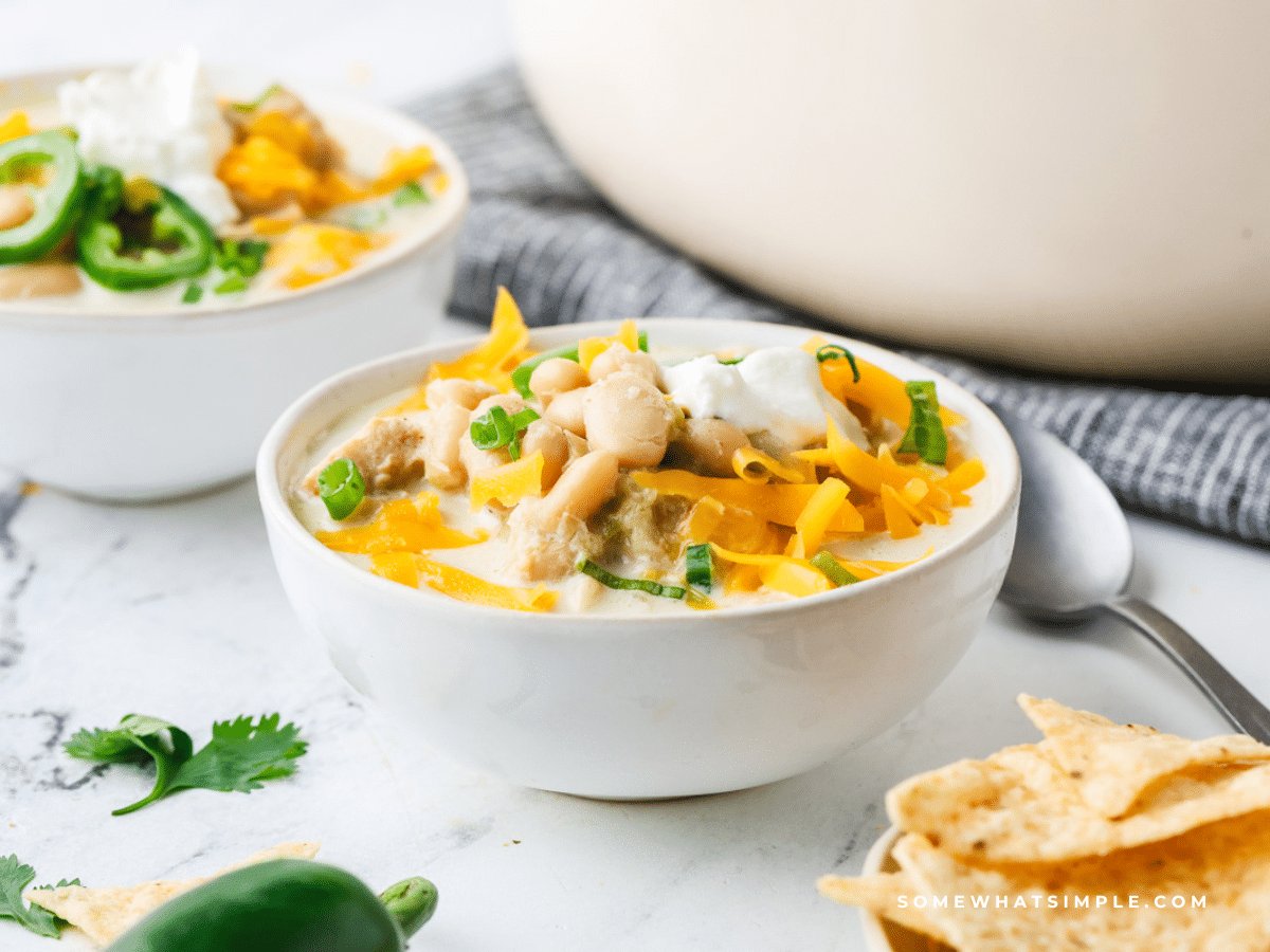 White Chicken Chili is a creamy broth packed with delicious chicken and hearty white beans. It comes together in a snap and tastes even better when you load up on some fresh toppings – shredded cheese, diced avocado… really any of your favorite taco toppings go great with this soup!