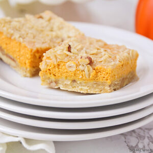 The perfect marriage of a pecan and pumpkin pie, these easy pumpkin pie bars are a deliciously fun way to feed a crowd.